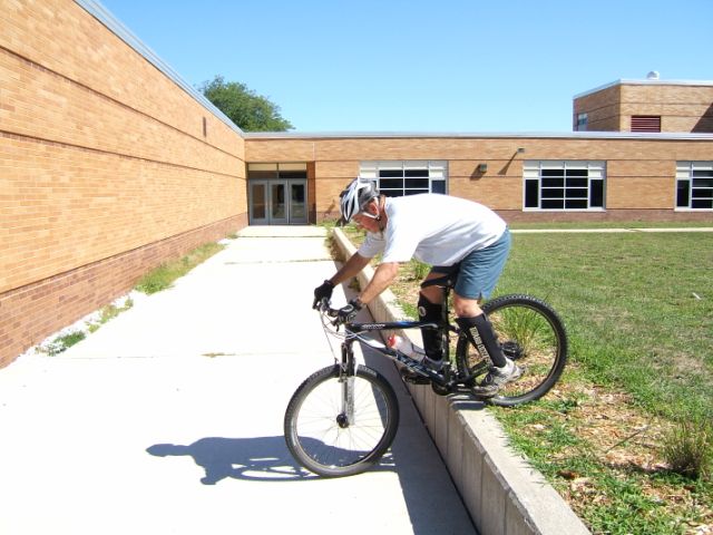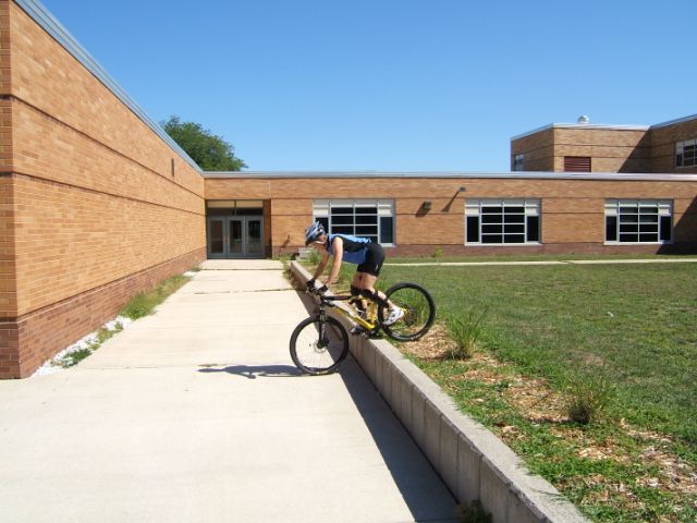 Terri rolling the drop – around 15″ high, about as big as possible without chunking the chainrings 🙂